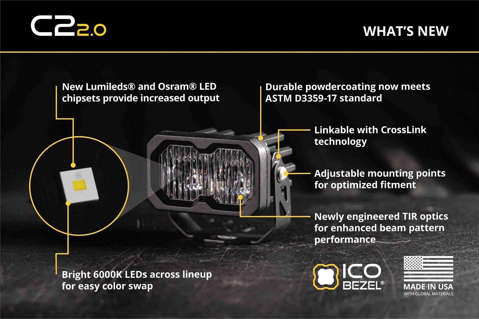 Swappable Optics and Colors. Just like before, the lenses on the C2 are swappable. But here’s what makes the C2 2.0 even better–they now use the same high-output Cool White LED chips for both white and yellow LED pods. This means changing your optic and color is just a simple lens swap away. No need to worry about color variation when switching from yellow to white! Click here to view our full lineup of replacement lenses.